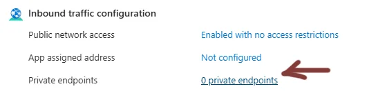 Head back to the configuration for your API App (which you’ve already integrated with the VNET), go to the Networking Tab, and click the bit that says “0 Private Endpoints” to configure a new one.